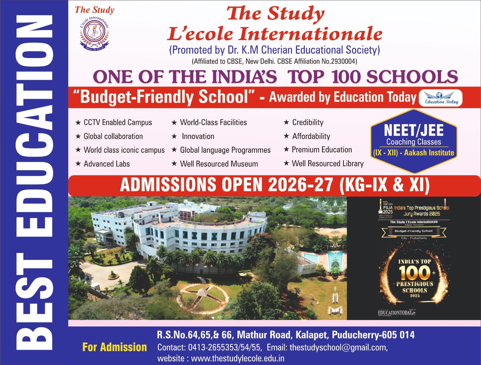 Dr.K.M.Cherian Educational Society, in a response to the need of creating Futuristic Schools, to cater to the present generation, laid foundation to The Study-L’école Internationale in 2006 with 25 students and 4 teaching and 5 non teaching staff. An International school set in an idyllic 22 acres lush green campus. Its tranquil vicinity, secure environment, aesthetic infrastructure and complementing ambience make it a perfect place for education. It is affiliated to the Central Board of Secondary Education (CBSE), New Delhi (in the year 2010) and committed to the cause of moulding young minds. True to its motto, TO EXPLORE…TO EXPERIENCE… TO EXCEL…,the school has excellence at its core.